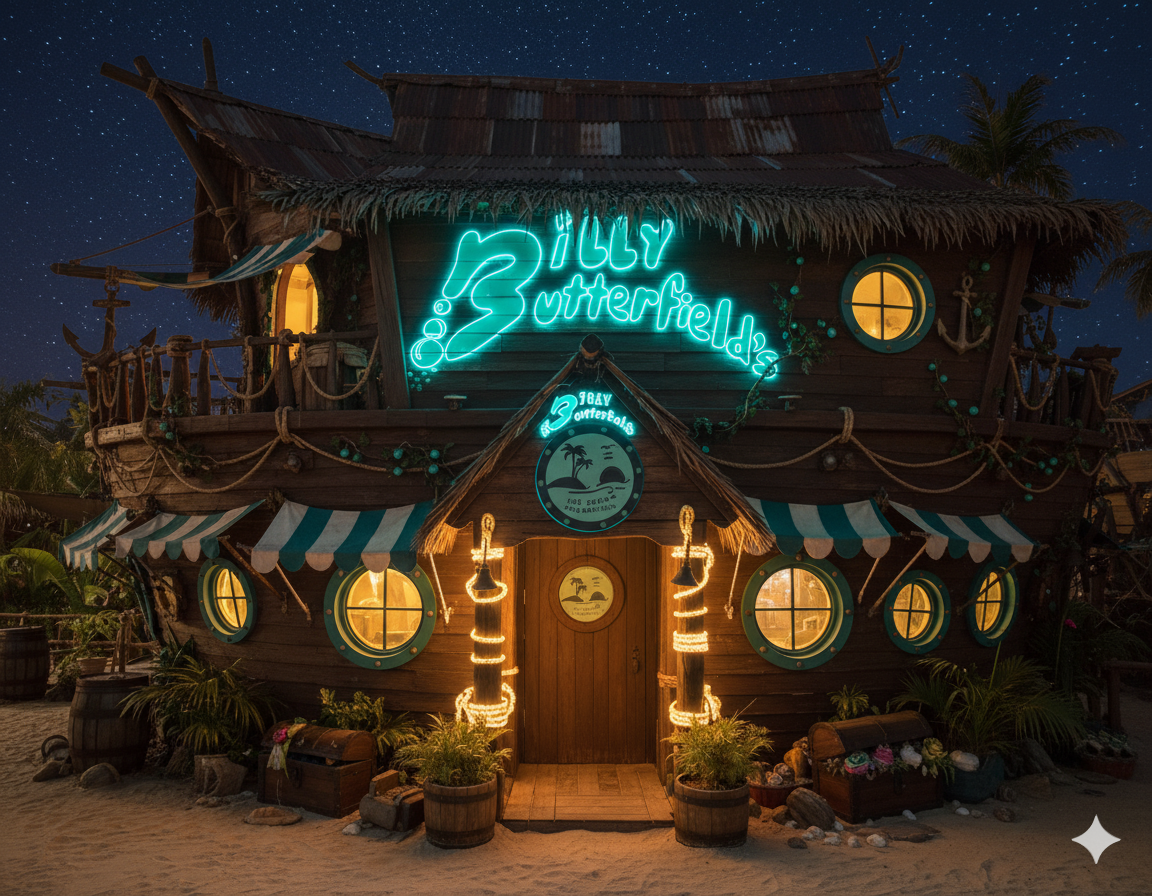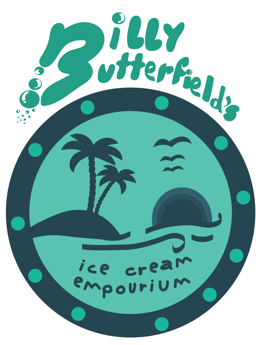 The logo for Billy Butterfield’s Ice Cream Emporium captures the playful spirit of a tropical island pirate adventure. Inspired by cheerful pirates and the legend of the Golden Scoop, the design blends tropical motifs, whimsical iconography, and bold typography to create a fun, memorable brand identity that appeals to both kids and adults. The logo visually conveys joy, adventure, and sweetness, setting the tone for the immersive experience of the emporium.