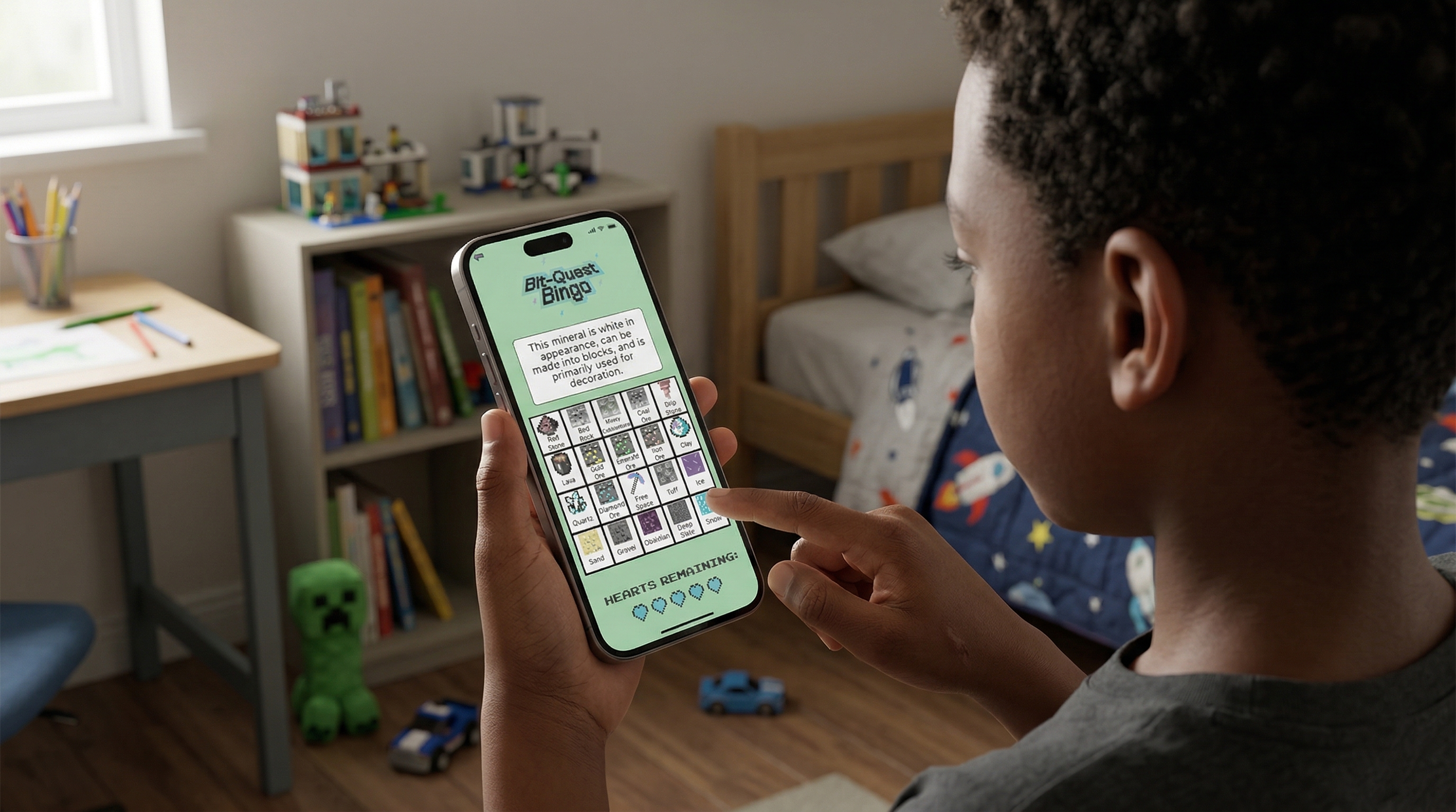 ❋ VisualsThe app features a 5x4 bingo board populated with images of Minecraft-inspired blocks and items related to earth science. When selected, each tile presents a statement or question. Visual design emphasizes clarity, playful interaction, and intuitive feedback, including “lives” indicators, winning/losing screens, and consistent iconography to support learning and gameplay.